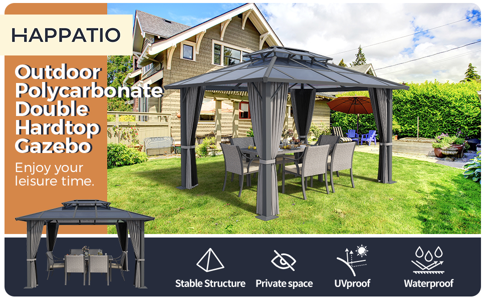 DOUBLE-LAYER POLYCARBONATE TOP: Our gazebos feature a double-layer polycarbonate roof. A double-layered hardtop allows for airflow and adds stability to the gazebo. Semi-transparent polycarbonate panels filter out 99% UVproof and help keep the gazebo cooler. All panels are also fade-resistant and built for all-weather use – that means you can enjoy outside time year-round.